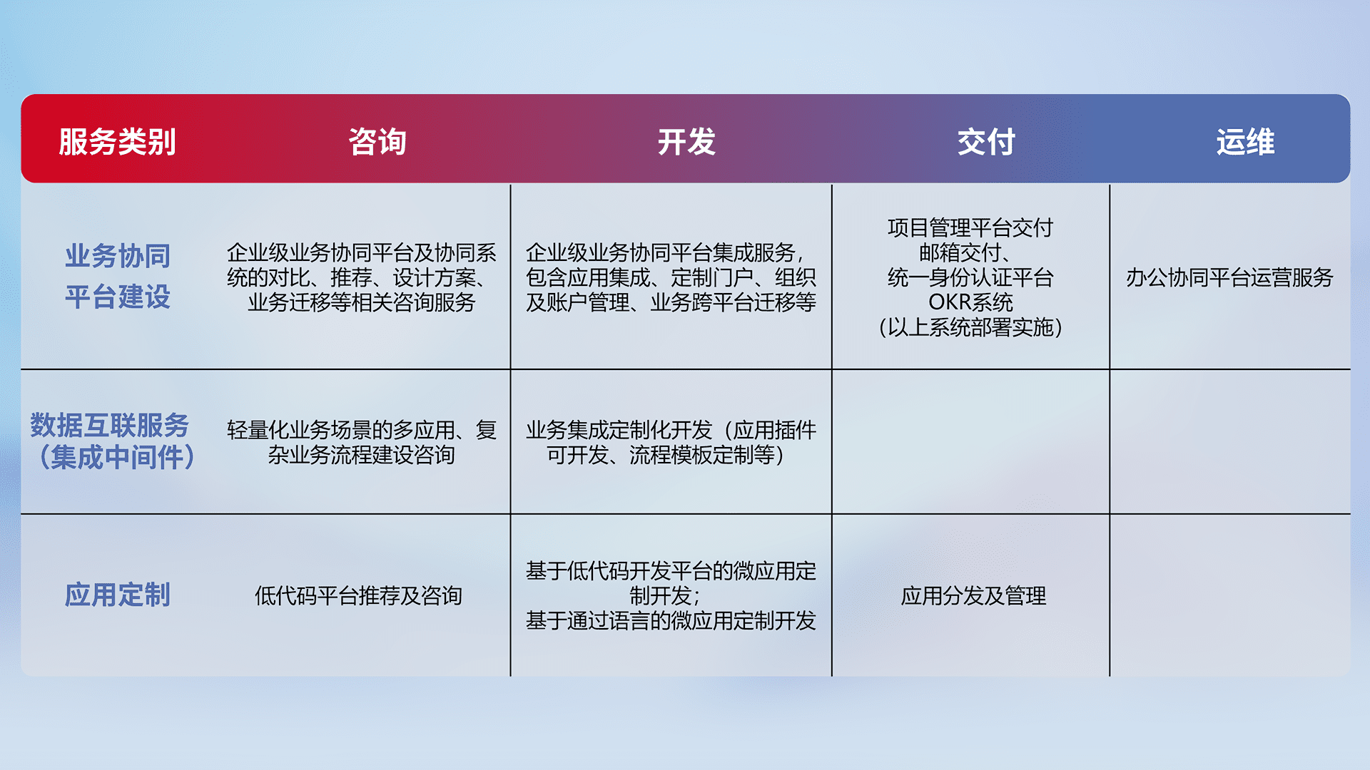 针对钉钉、、企微、、IDaas等平台级产品提供产品的规划、、、、方案、、、、交付、、定制化开发等服务,,,,实现如统一协同办公、、智能客户服务、、、混合会议管理、、、智能数据查询、、、等业务场景,,实现数字化转型。。。。